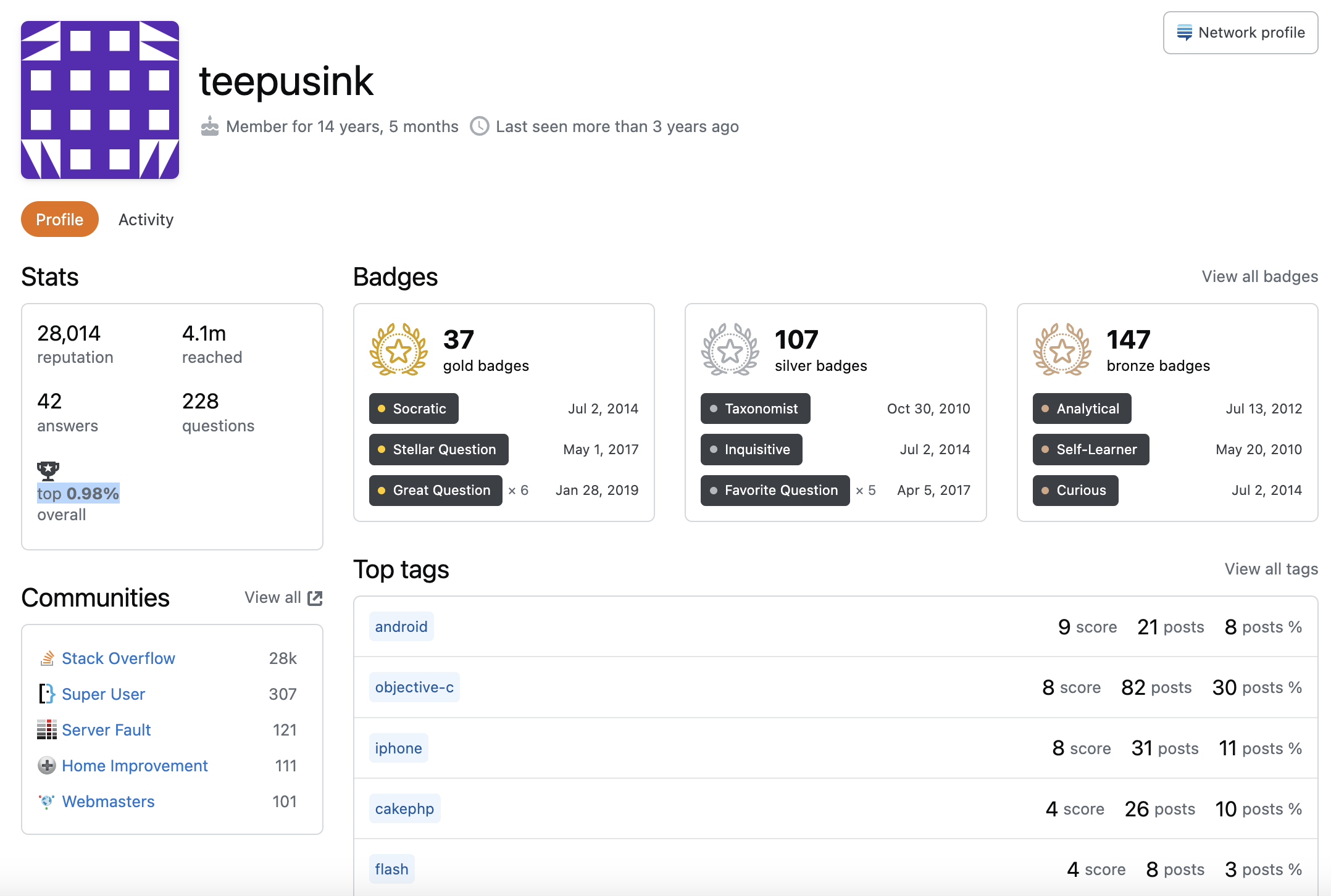 Recently, I revisited my old StackOverflow page and was surprised by the statistics. At the time I asked those questions and provided answers, I didn't believe they would be particularly valuable. Yet, it turns out they placed me in the top 0.98% overall with 4.1 million reached, despite not having been active for nearly 3 years and not having posted in at least 8 years. It highlights the power of compounding results. You simply need to take the first step.